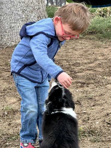 Aussies are active yet easy-going dogs that love to romp with children. They tend to get along well with other pets. The breed is considered highly intelligent and easy to train. Aussies are known for being especially eager to please their owners. Our dogs and puppies get lots of socialization with our grandchildren.